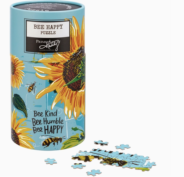 A 1,000 piece puzzle featuring a hand lettered "Bee Kind Bee Humble Bee Happy" sentiment with bee and sunflower designs. Puzzle pieces are packaged in a resealable plastic bag and enclosed in a cylindrical box with a full wrap-around design and a descriptive "Bee Happy Puzzle" sentiment on lid. Our Bee Kind Bee Humble Bee Happy puzzle includes a 10" x 8" printout of full puzzle image for reference.