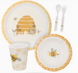 A cohesive meal set featuring a dishwasher safe bowl, plate, cup, fork, and spoon with block print bee designs. Meal set is BPA-free, thoughtfully made with bamboo fibers, and packaged in a high-quality kraft paper box making it ready for easy gifting. Another adorable addition to our exclusive Happy + Bright Collection. Our Bee Skep meal set is not microwave safe.
