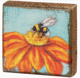 A wooden block sign featuring a bee on a flower. Design is replicated from original artwork painted directly onto burlap canvas, giving a unique depth and texture to the art. Easy to hang via predrilled keyhole slot or can free-stand alone.