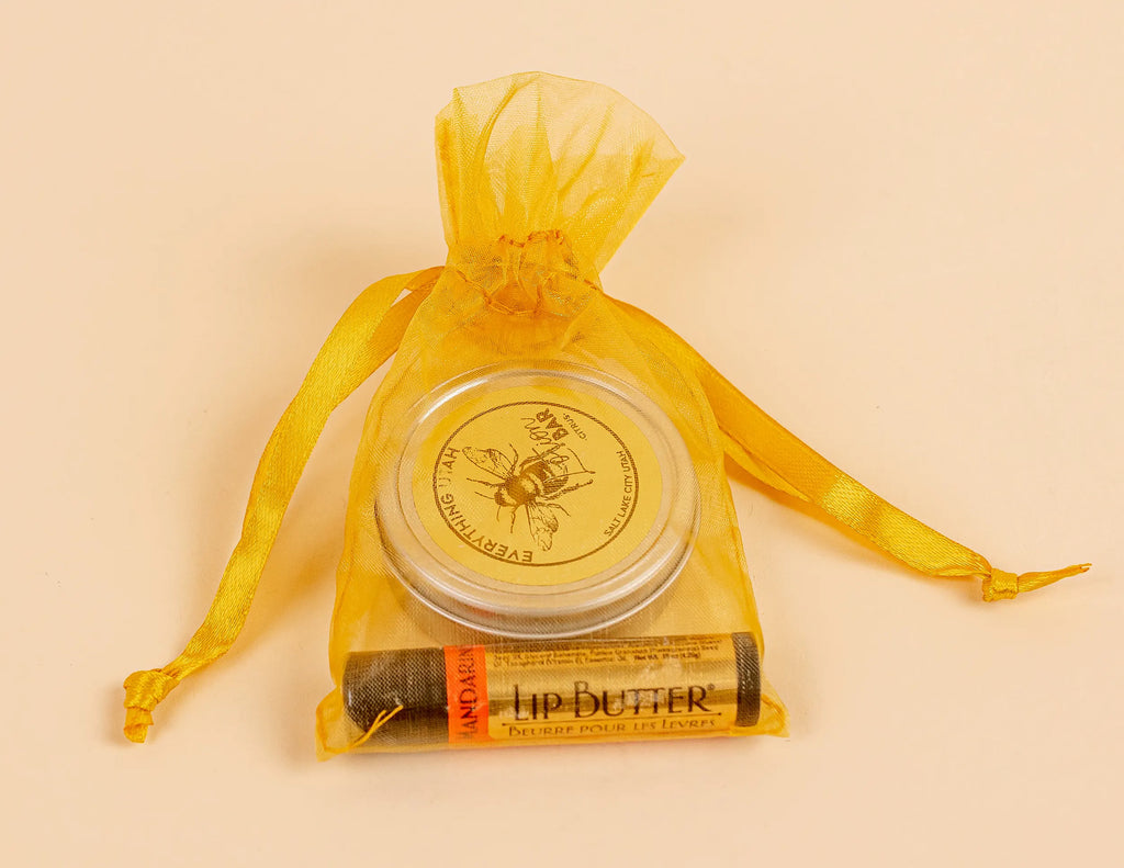 Combining our top selling products Bee Bar Lotion and Lip Butter into a quick pick-up gift set. 2 Piece Gift Set includes a Small Bee Bar Lotion (.6oz) and Lip Butter Tube in an tagged organza bag. Bee Bar is a solid lotion bar! Rub Bee Bar on your skin, it is an unprecedented as a soothing moisturizer for dry, hands, feet and body. Lip Butter is a rich with anti-aging antioxidant oils and Shea Butter, our soothing Lip Butter will drench dry, cracked lips in moisture, refreshing and rejuvenating them for visibly smoother lips!