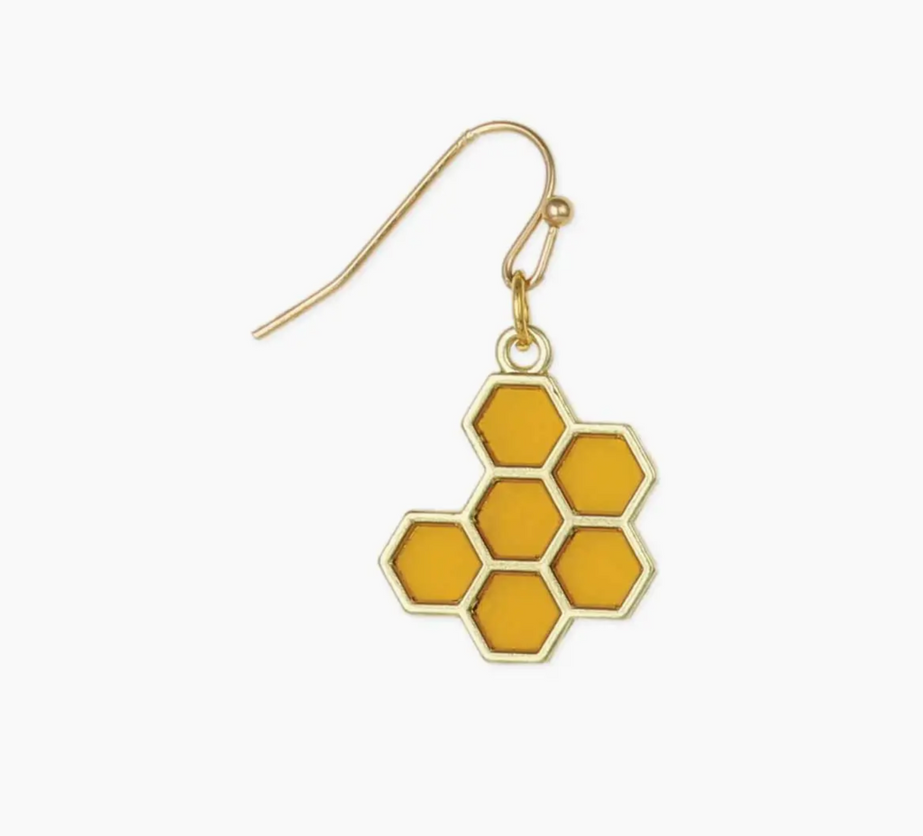 A gold earring sweet as honey! Gold honeycomb earring includes amber colored resin adding a warm drop of color to your look. Garden inspired honey earrings with sweet appeal.